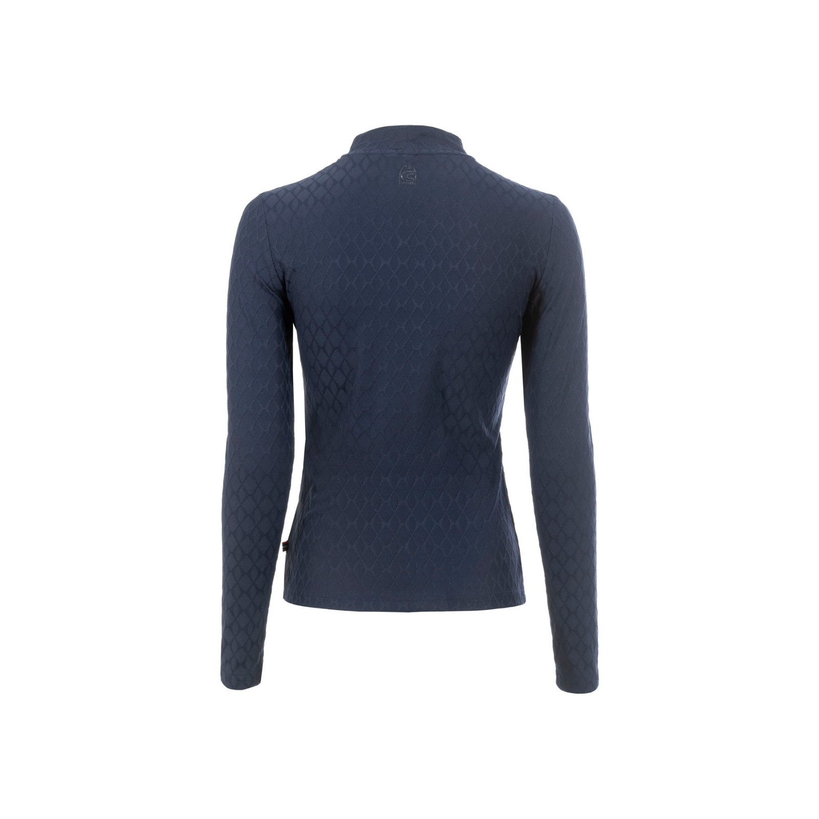 This Cavallo CavalRabia Ladies Long Sleeve Base Layer in navy features a stand-up collar crafted from soft, functional fabric for comfort and performance. It is detailed with a refined Cavallo 3D artwork on the left chest and a sparkling Cavallo stirrup made of crystal stones positioned centrally below the collar at the back, combining style with technical design.