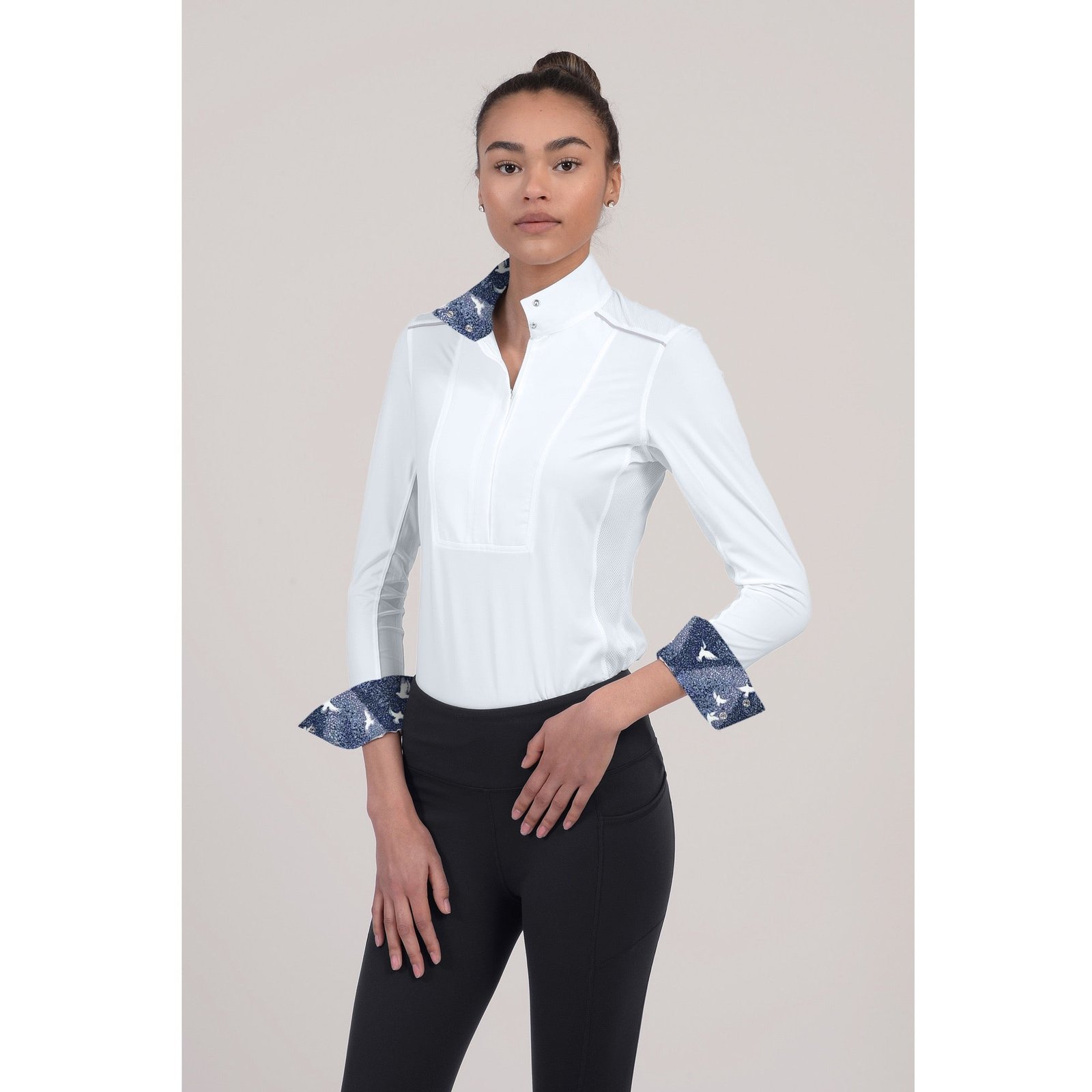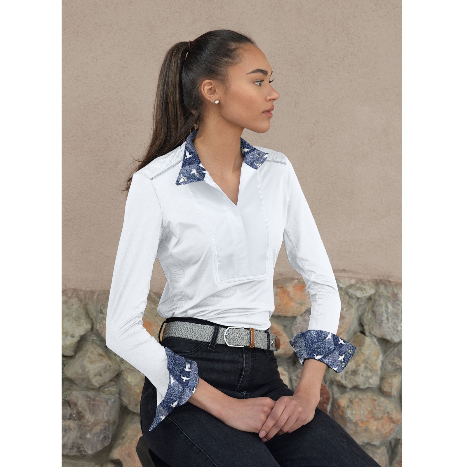 You asked for a SkyCool® Show Shirt and this shirt delivers. Made of the lightest weight fabrics to give you the lightest weight sun shirt ever. Feel the cooling comfort in warm, humid weather conditions by converting sweat into cooling energy so you stay dry and comfortable. SkyCool® fabric is infused fiber technology for cooling, moisture absorption, fast drying, 2-way air circulation and 50+ UV protection. 4-way stretch flat weave fabric offers more stretch and superior comfort. Classic white poplin bib, collar and cuffs lined with unique Liberty® London prints, mesh shoulders, sides and underside sleeve inserts add additional cooling airflow. Pull-over style shirt features a hidden low profile YKK zipper placket and no-show collar and cuff snaps for a polished show look, stock tie loop, shirttail hem and a tailored show fit.