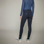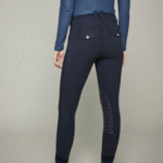 These riding pants from the Dada Sport range are designed in microfiber to offer maximum movement while providing a shaping effect and optimal comfort. The Giovani grip is made with a minimum of seams to limit friction points with the saddle and stirrup leathers. Giovani grip has two transparent patches formed by the Dada Sport logo on the inside of the knees for better stability in the saddle. The particularity of these pants is the work at the waist, their waist is low on the front and high on the lower back for optimum comfort. Its bi-stretch fabric elastic is inserted for better support without compressing and marking the waist. To add style to Giovani’s grip, every detail is essential, the pants close with two golden hooks bearing the DADA logo. In addition, two slant pockets on the front decorated with a braid and two false rear flap pockets with a horn effect button finalize the silhouette. A side label with the DADA logo adorns the right rear pocket.