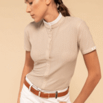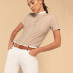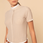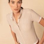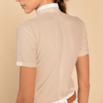 Micro-perforated short-sleeved technical polo shirt for summer with a refined design. Rigid officer collar. Slim fit but not adjusted to emphasize the waist. Long front opening, invisible buttons. DADA logo on the left sleeve. Perforated and eco-responsible technical fabric. The polo shirt’s design is very clear: the buttons are hidden under a button placket—a graphic panel on the back. The fabric is micro-perforated for great breathability and density, preventing it from being transparent.