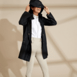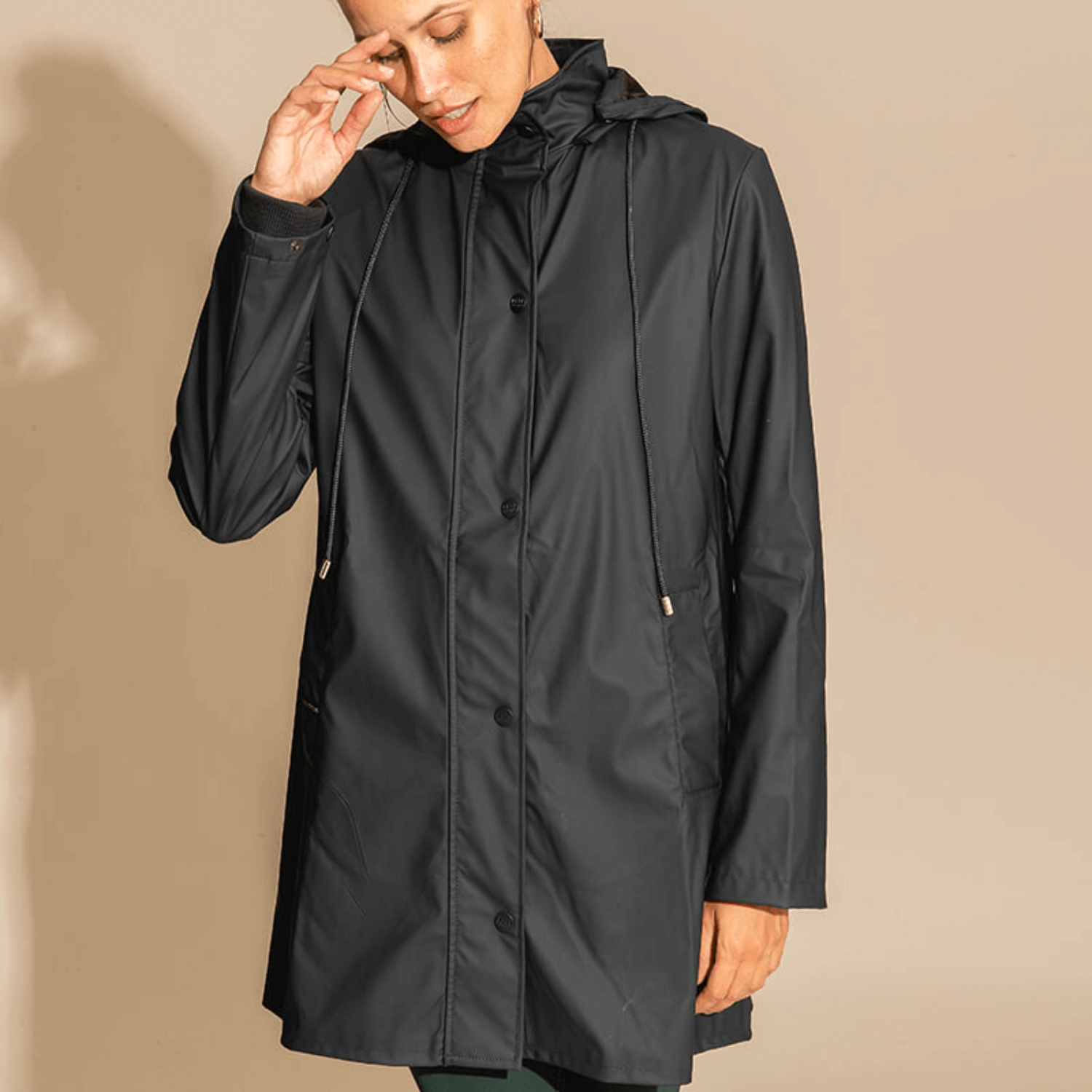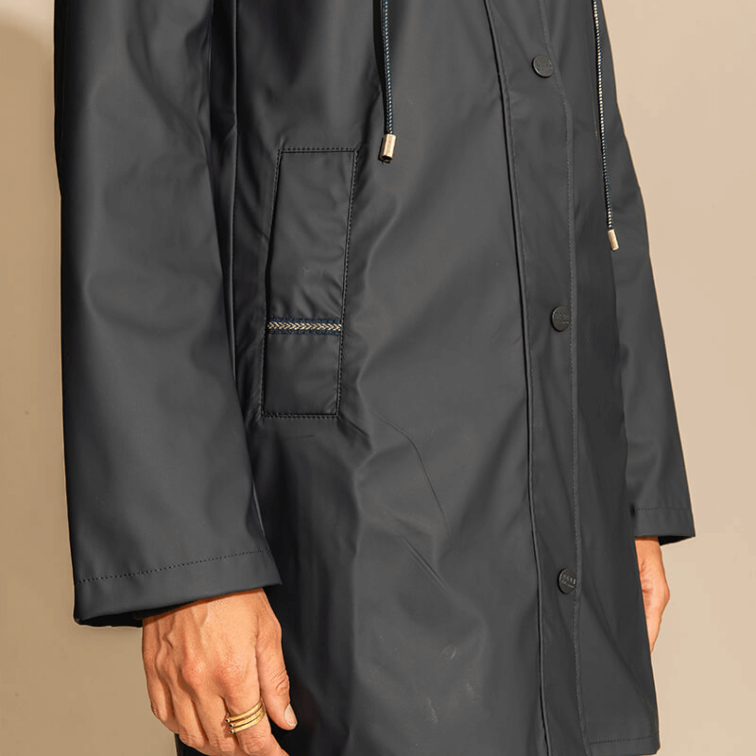 Mid-length raincoat. Slim fit, trapeze shape, removable hood. The fabric is waterproof.