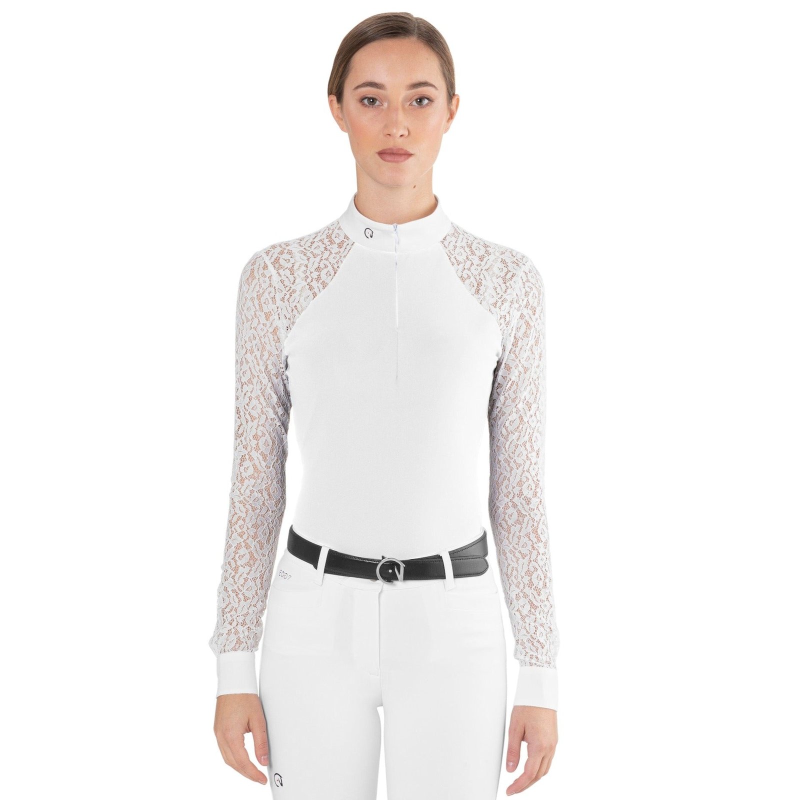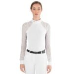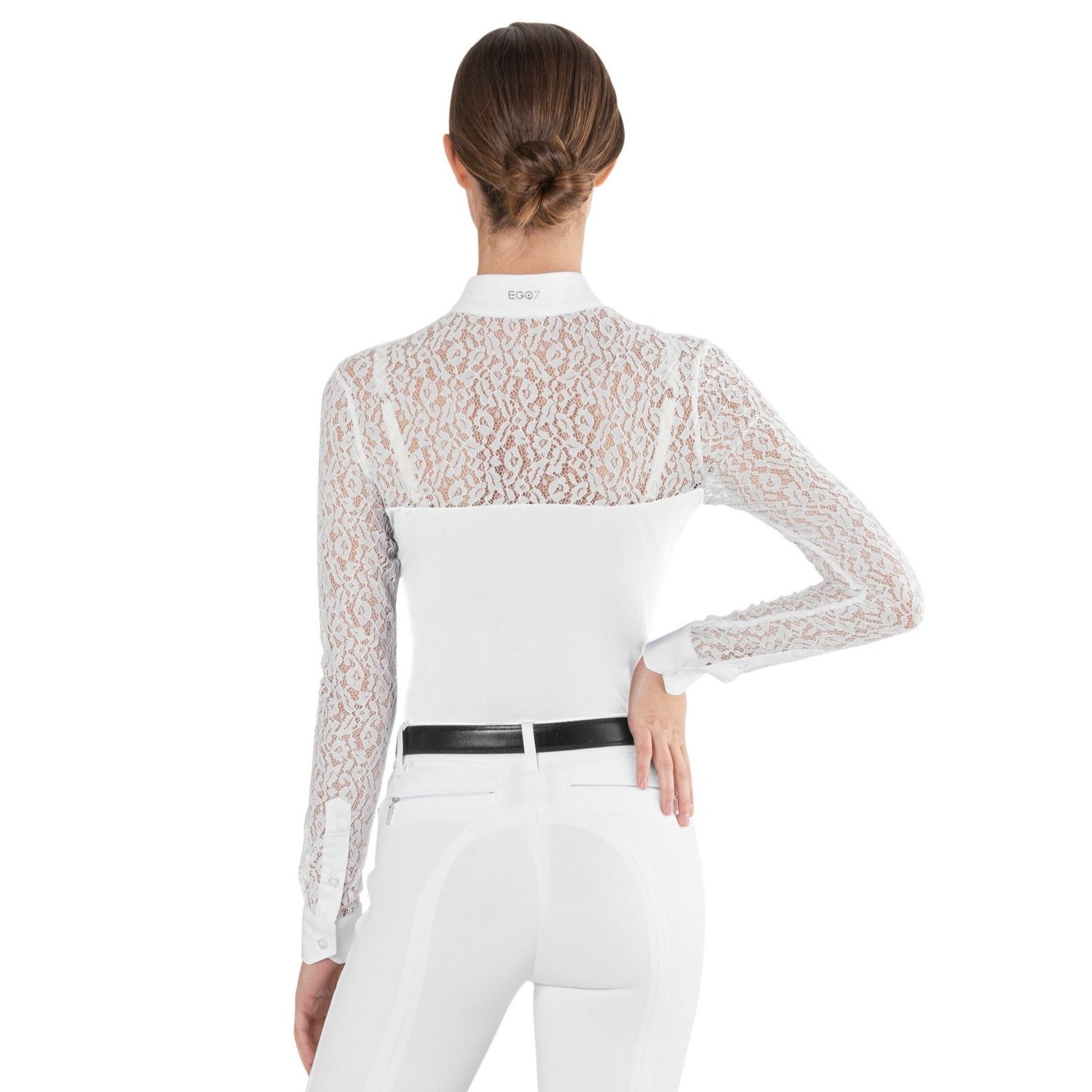 Ladies Long Sleeve Show Shirt Florentine – jaw dropping elegance combines with high tech performance to bring you this incredibly luxurious ladies long sleeve competition shirt from Italian brand Ego7. The high tech, quick drying and highly breathable main fabric is complimented to perfection with beautiful lace detailing on the arms to give the shirt a dignified look. The anti-wrinkle fabric ensures it is easy care when away competing. The final touches of a crisp white collar and sleeve ends add definition to the shirt to give it a professional look without taking away from it’s exquisite looks.