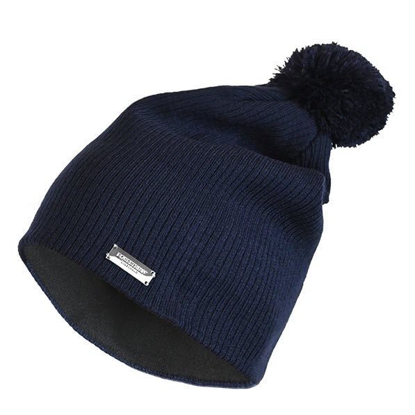 Cozy beanie in a classic navy design with silver details. Nice soft fleece lining by the ears to keep you warm.