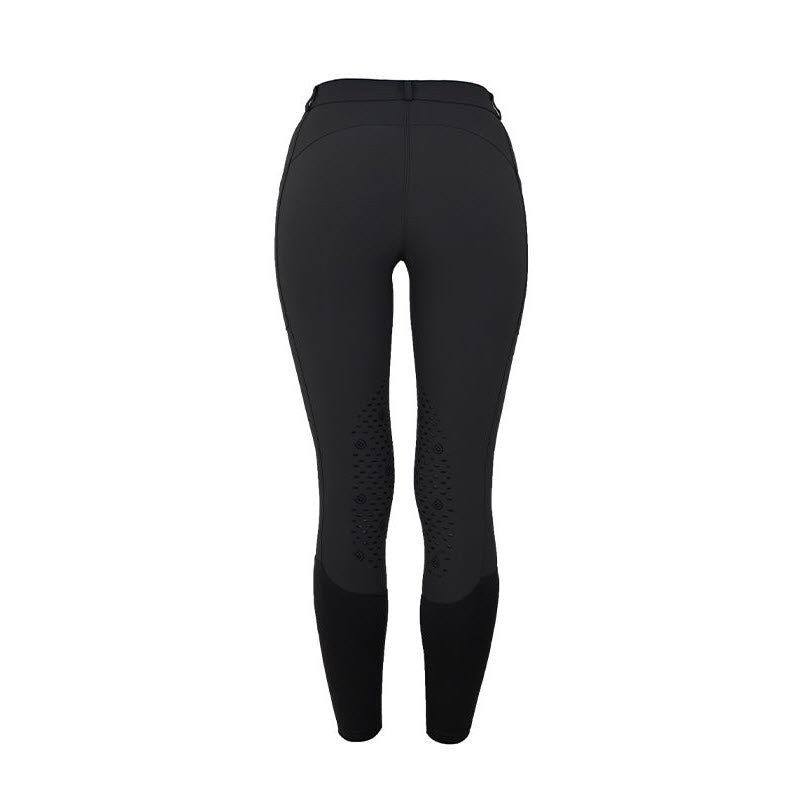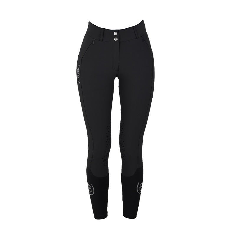 Classic black riding breeches with knee grip and medium high waist. The breeches are created with 4-way stretch in a soft fabric for ultimate comfort and fit. Four well-sized pockets, two with a zipper and two mobile pockets on the sides. Decorated with two crystal buttons at the front. The knee silicon grip to keep you steady in the saddle. Comes in a wider size range. Normal in size.