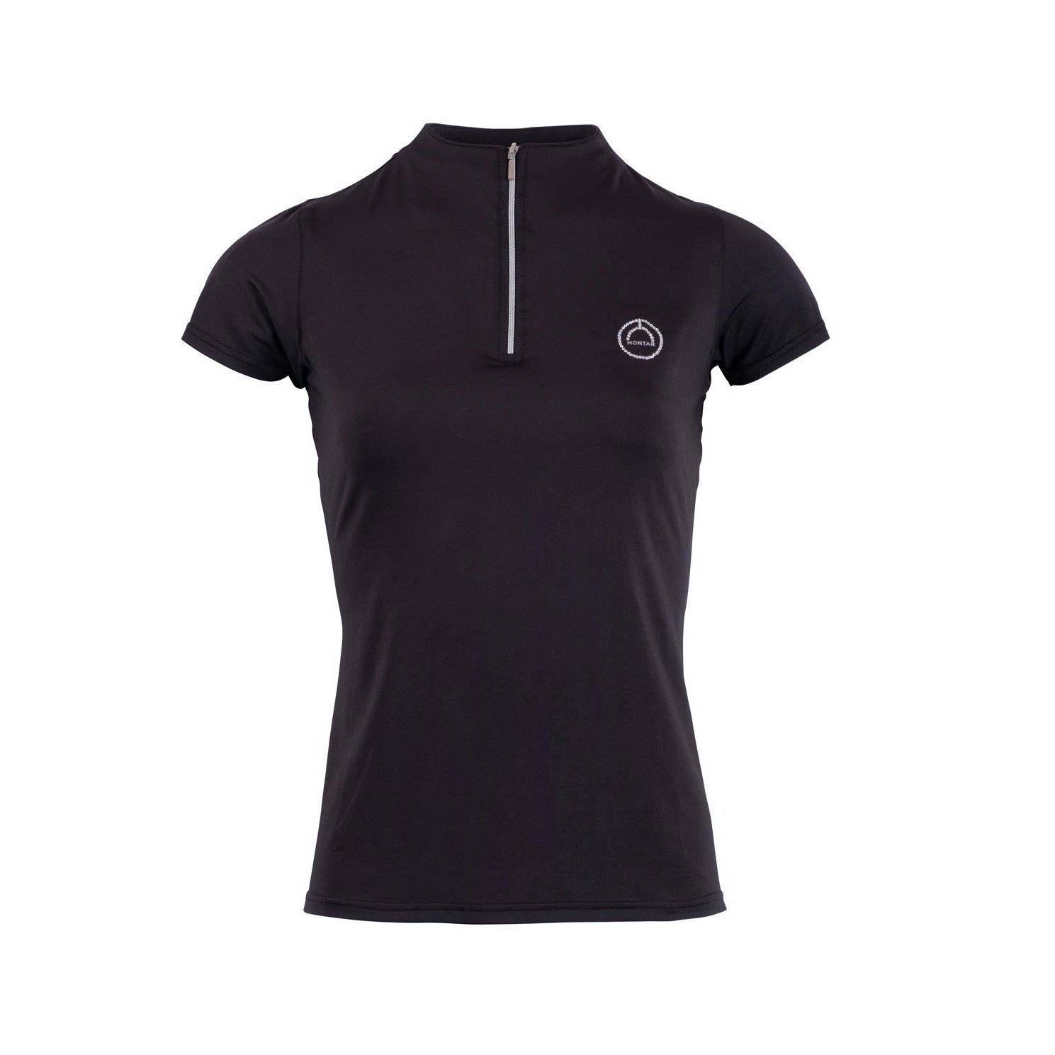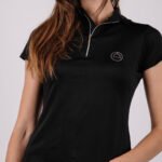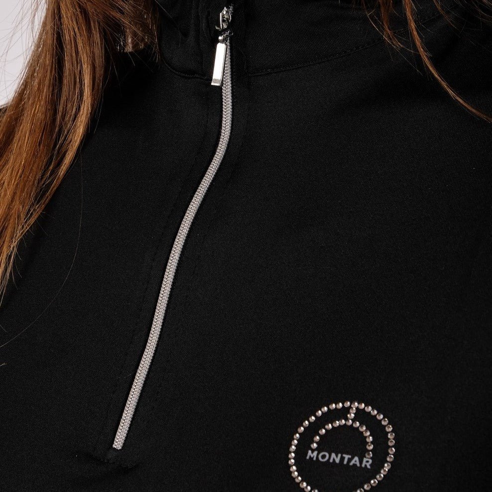 Everly Logo Polo in black with a low stand up collar. In the front is a silver neck zipper and on the left side of the chest is a montar logo in clear crystals 4 cm in diameter. The perfect polo for your classic equestrian wardrobe. The highly functional Mon-tech fabric is breathable and sweat absorbent, which ensures a comfortable feeling even when you work hard riding your horse.