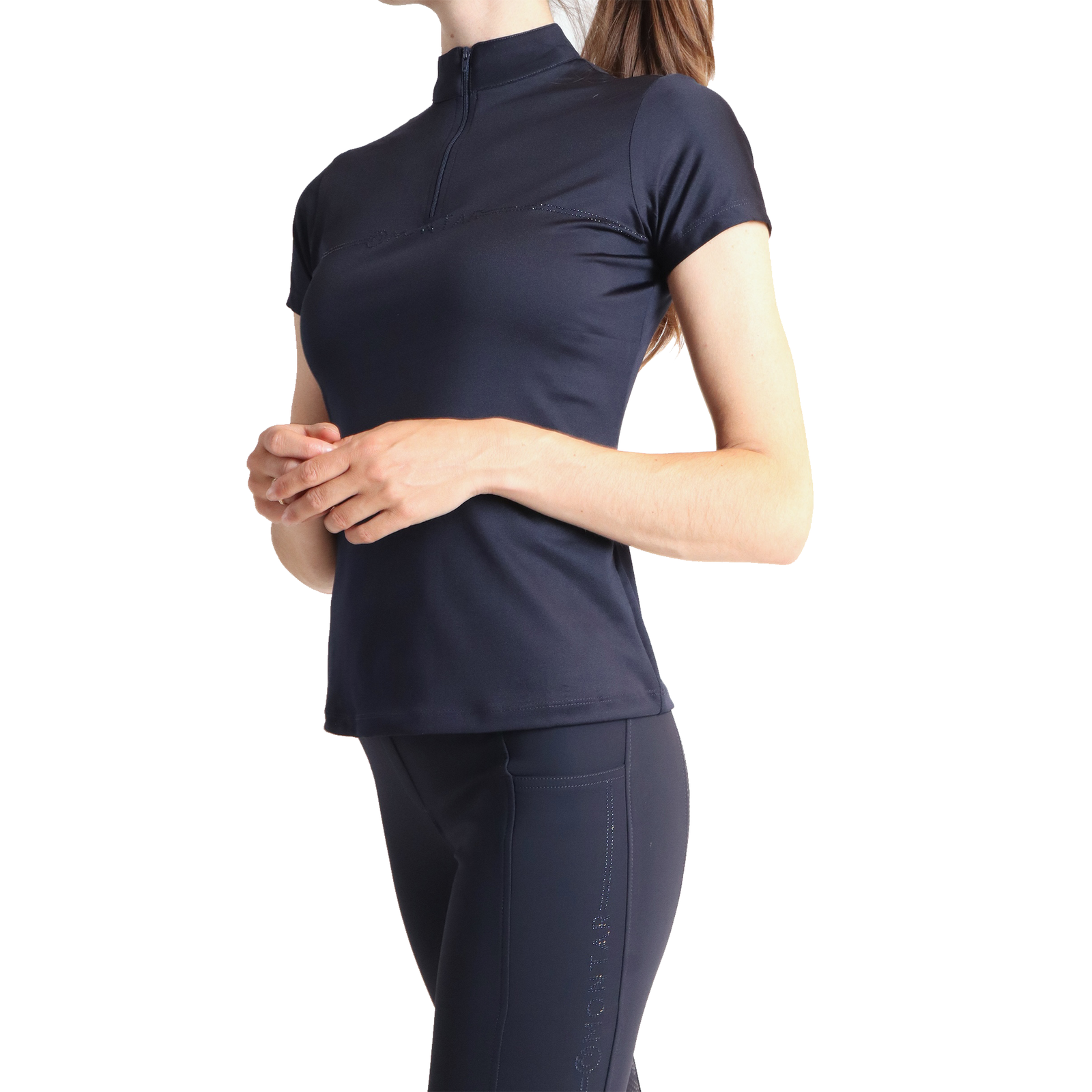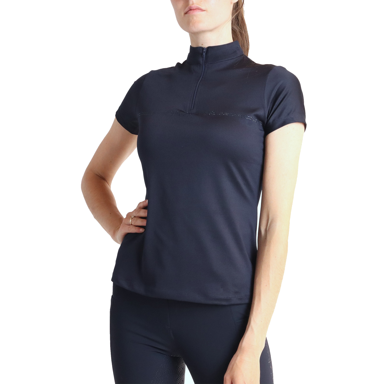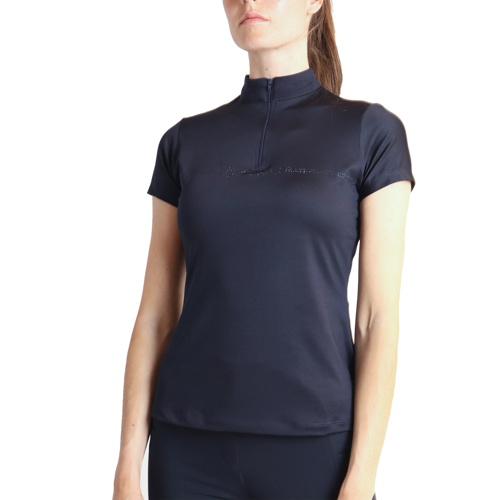 A Beautiful spring 2024 Short sleeved polo in our own Mon-tech fabric, designed to high performance. MoAviana polo is matching our Moaviana breeches and Pull on tights Crystals in 2 rows across the chest, and crystal logo. On Moaviana the Crystals are tone in tone with fabric. The MoAviana Polo in our Mon-tech fabric wicks sweat to help keep you dry and offer you plenty of support with a flexible and elastic fabric.