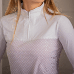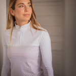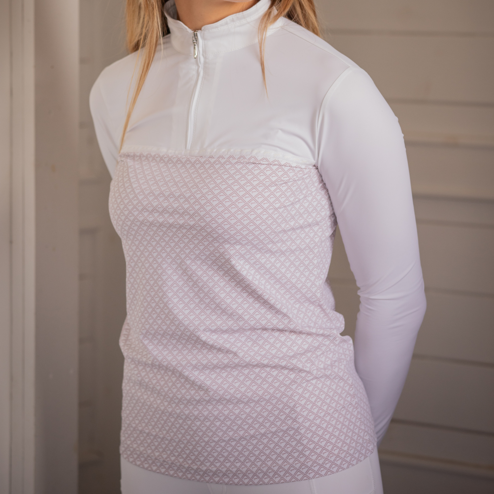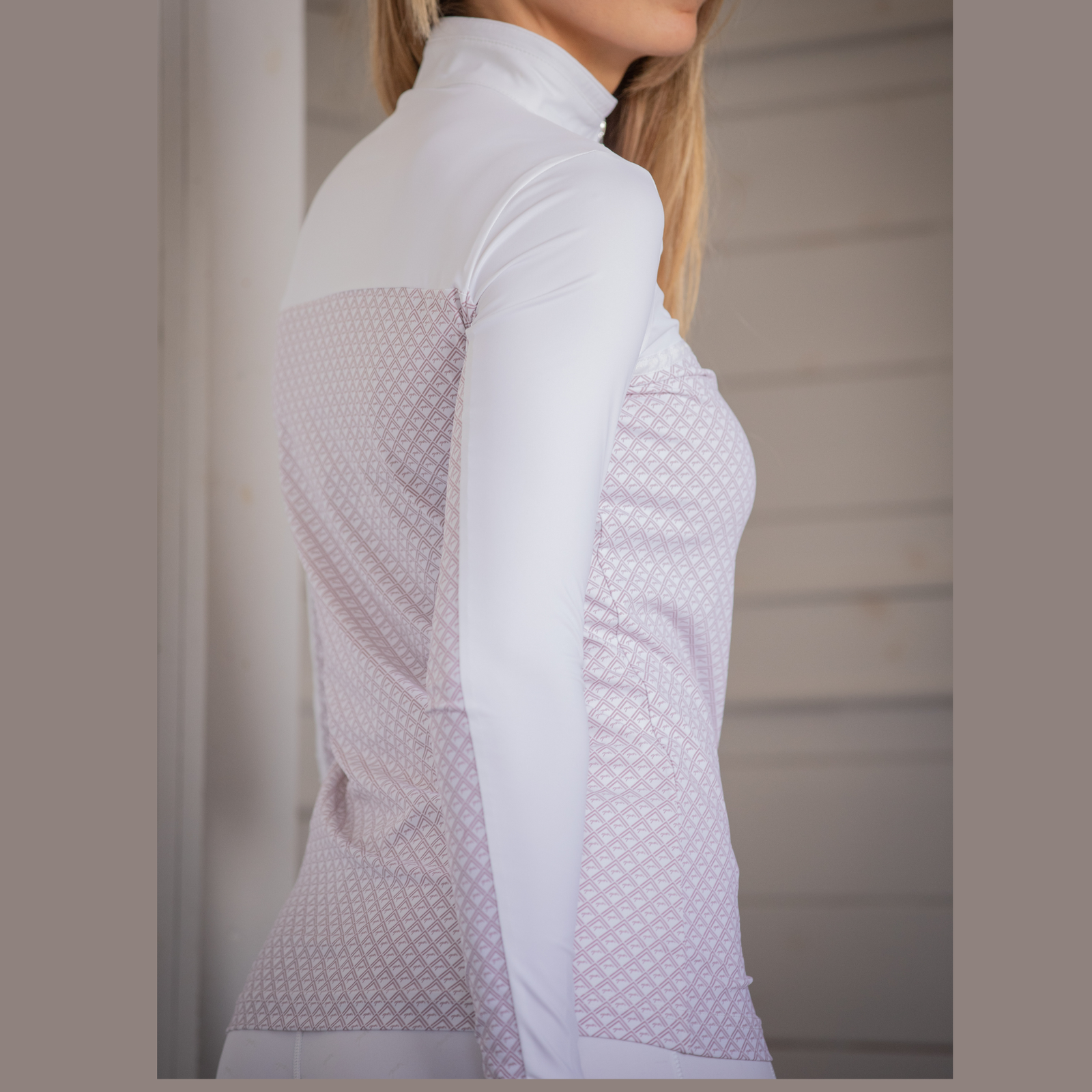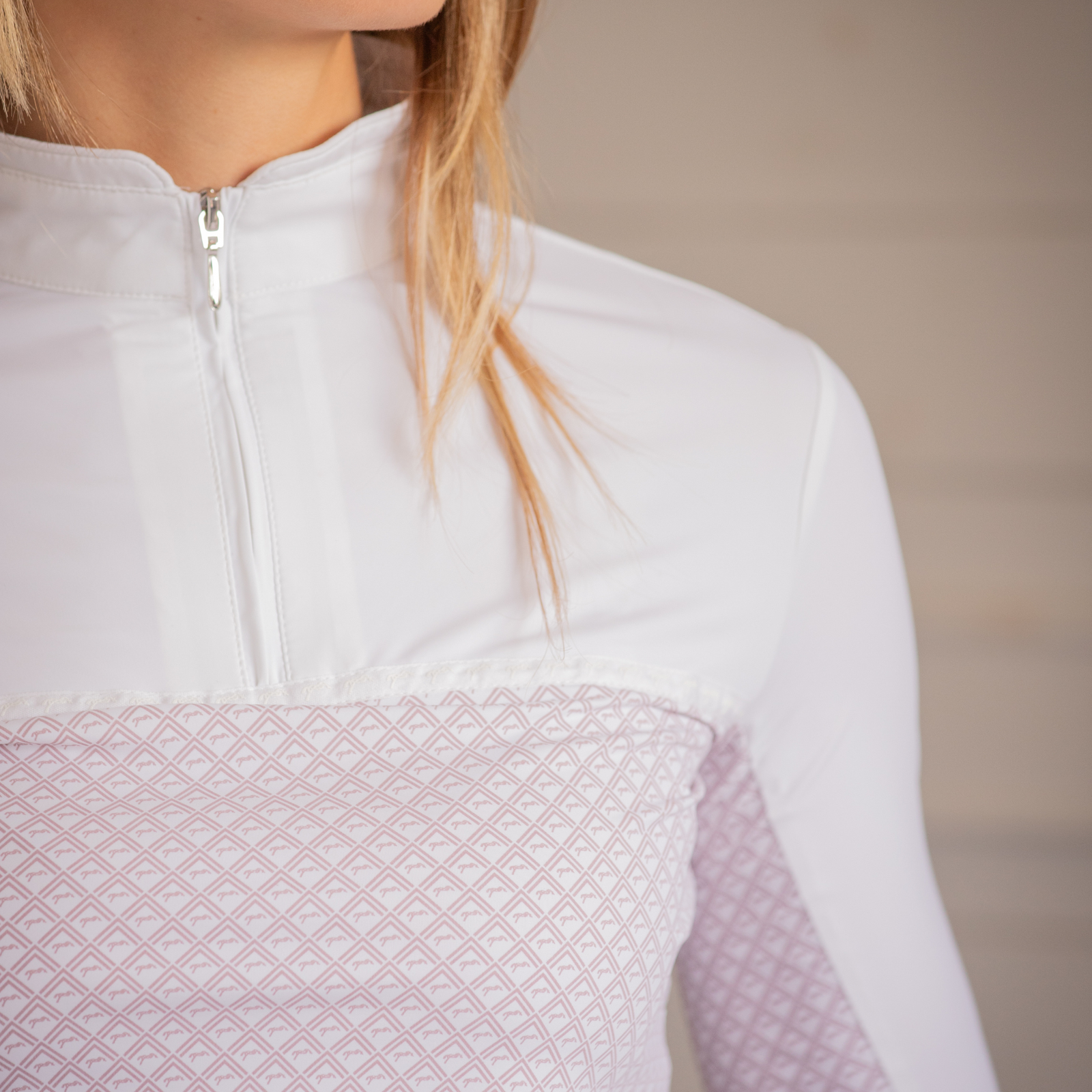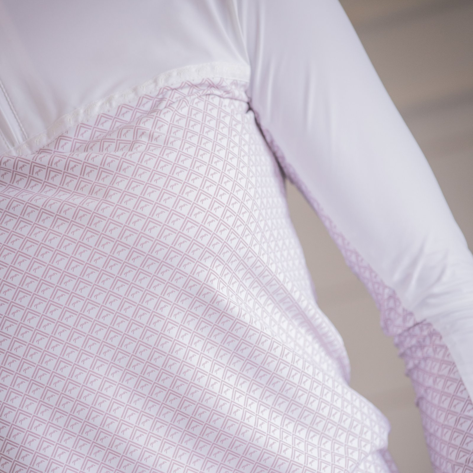 The Debbie Long-Sleeve Show Polo Shirt features a straight white bib bordered with a flat white trim, while the rest of the polo showcases a beautiful pink Pénélope pattern. It has an elegant mandarin collar that fastens with an invisible zip. Comfortable to wear, it is made from a lightweight and breathable fabric. With its chic yet sporty design, it is perfect for equestrian competitions.