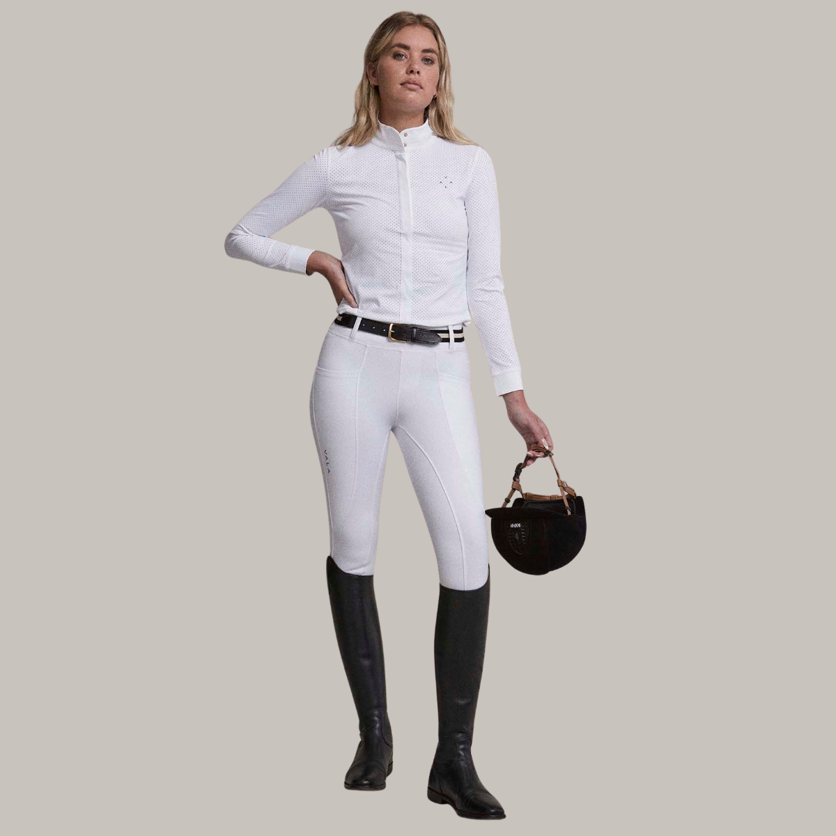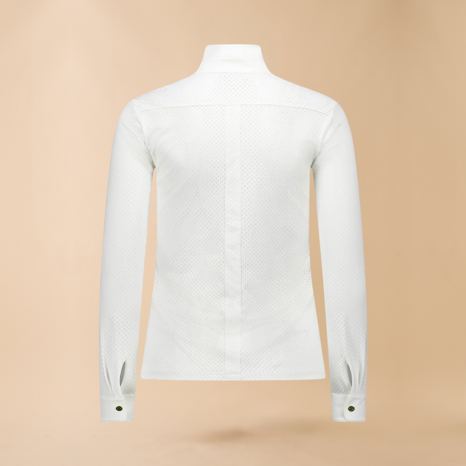 Experience unparalleled comfort and style with our Mesh Equestrian Show Shirt, designed for riders who demand both elegance and performance. Crafted in a classic white, this shirt features a clean, sophisticated design that’s perfect for any competition. The tailored fit flatters your silhouette while ensuring it doesn’t cling across the midsection, allowing for ease of movement and confidence in the ring. Made from butter-soft, lightweight, and breathable mesh fabric, this shirt keeps you cool under pressure, so you can focus on your ride. Whether you’re competing or simply enjoying a day at the barn, our show shirt combines timeless style with modern comfort, making it an essential addition to your equestrian wardrobe.